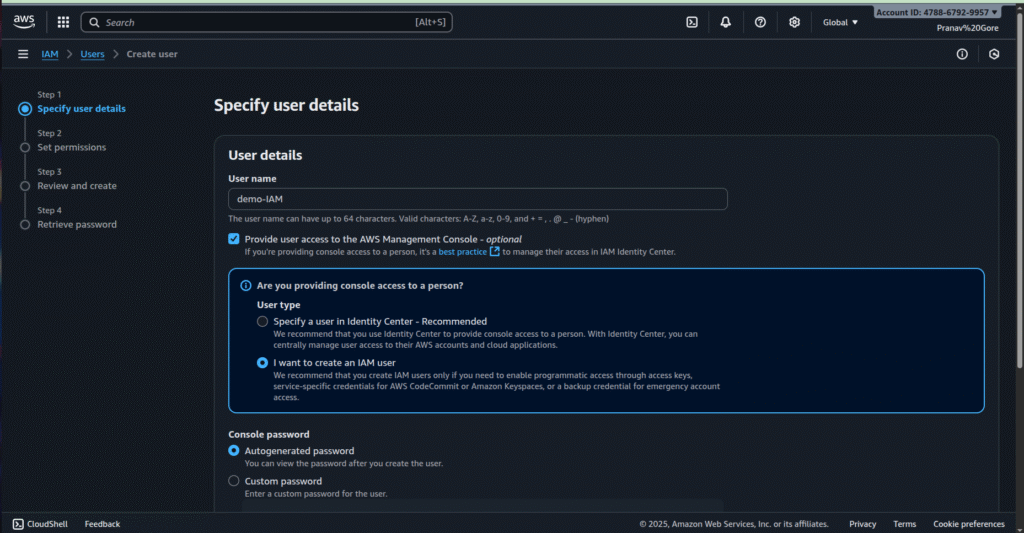 - Enter a user name (e.g., demo-IAM).