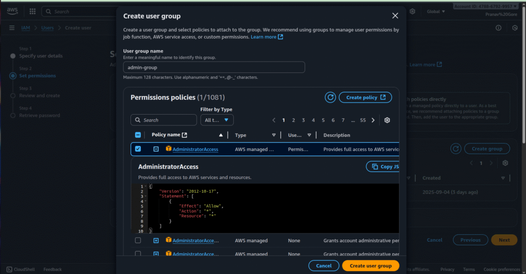 - Attach a policy like AdministratorAccess (AWS managed) for full access.