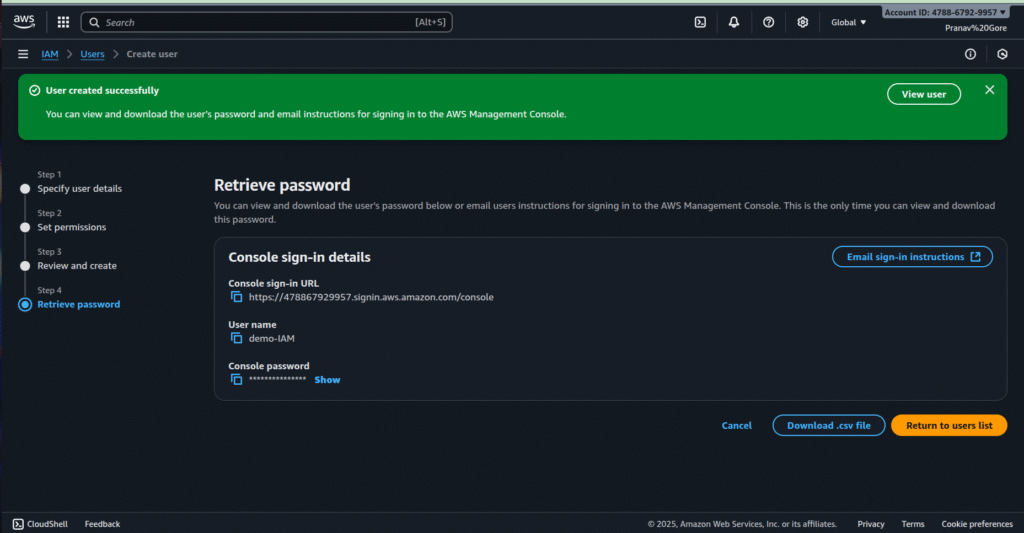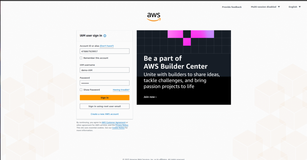 - Use your IAM username (e.g., demo-IAM) and password.