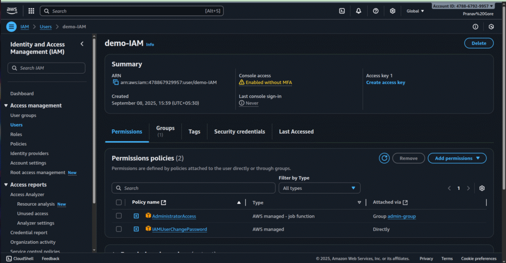 - Go to IAM > Users, find demo-IAM, and check permissions and security credentials.