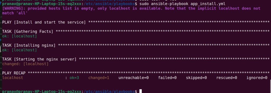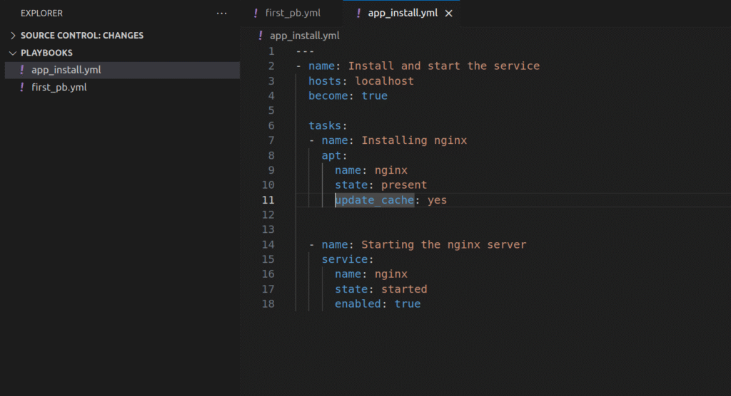 Below is the playbook to install and start Nginx on localhost. Let’s understand what each line does: